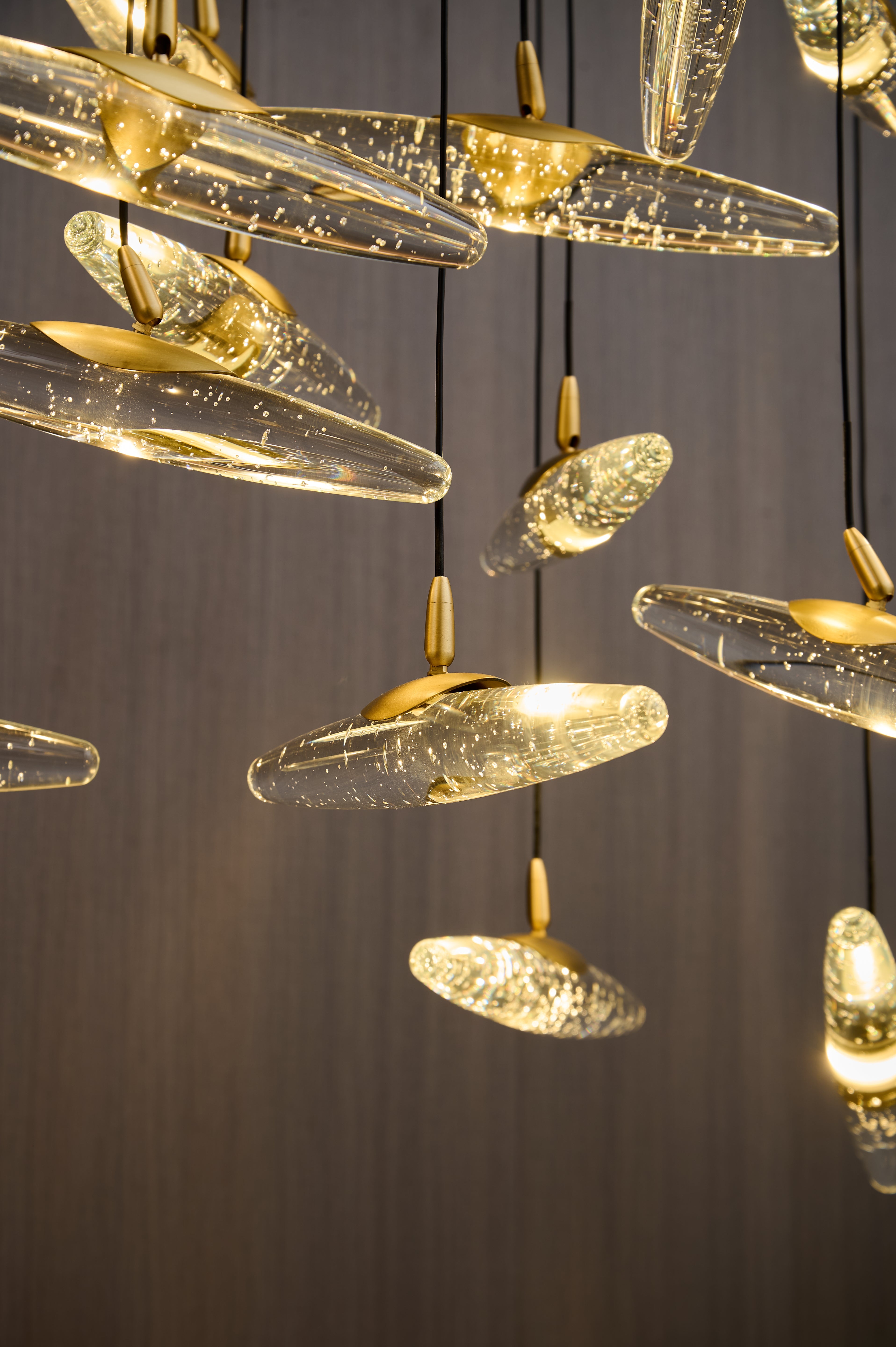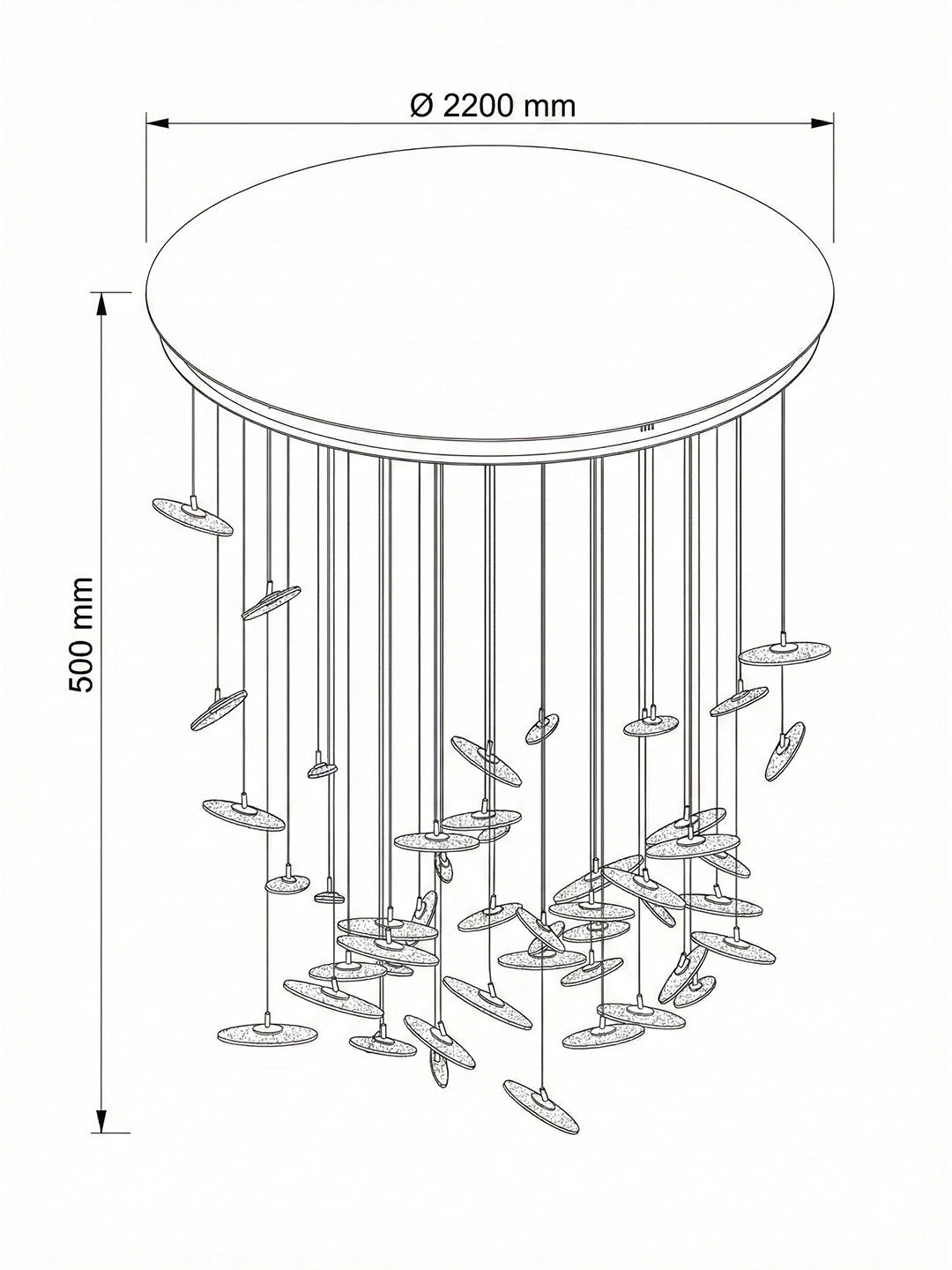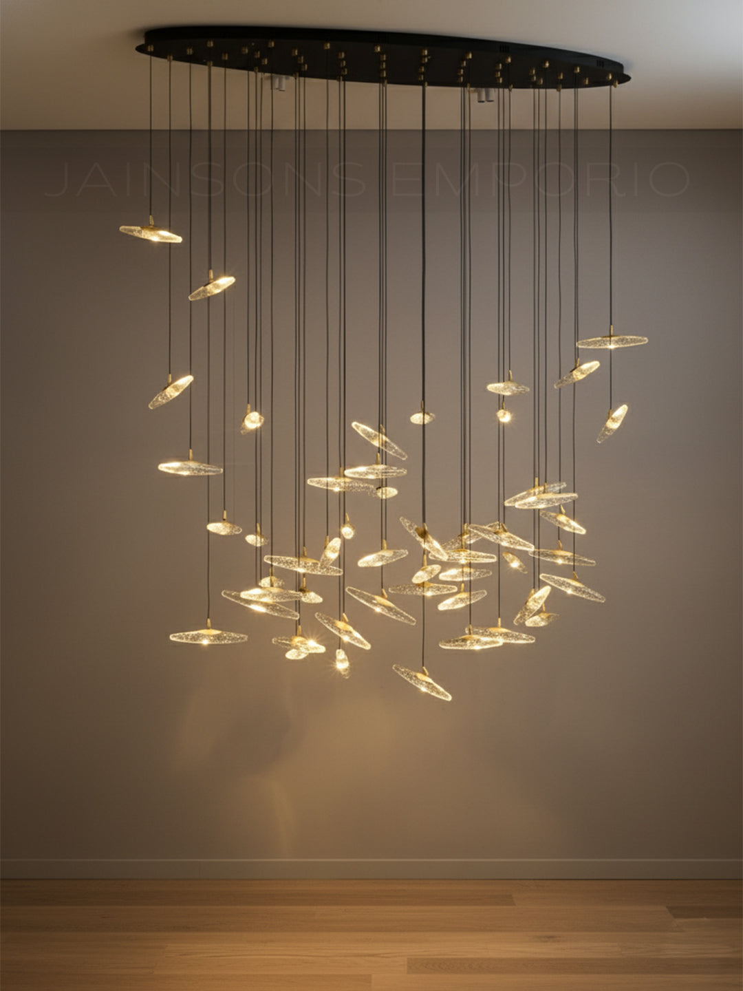 Designed to mimic a glistening downpour frozen in time, this masterpiece features textured glass discs suspended at varying heights from a sleek oval canopy. The gravity-defying arrangement catches the light from every angle, creating a mesmerizing, cinematic glow perfect for modern luxury interiors.