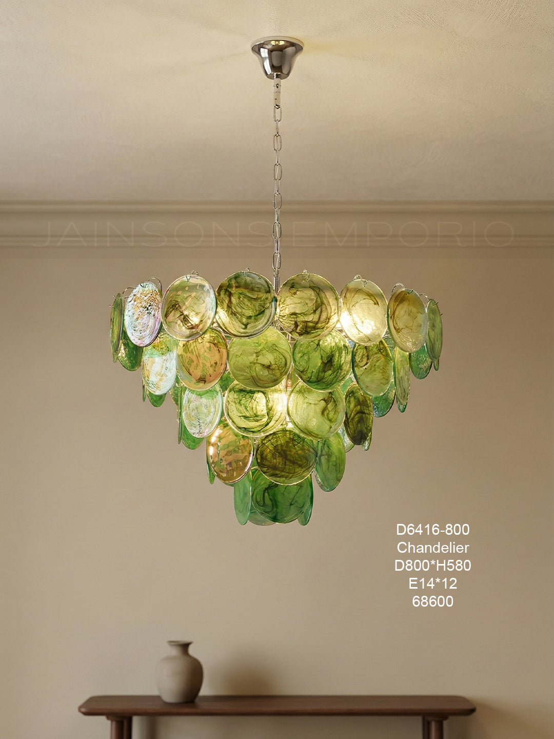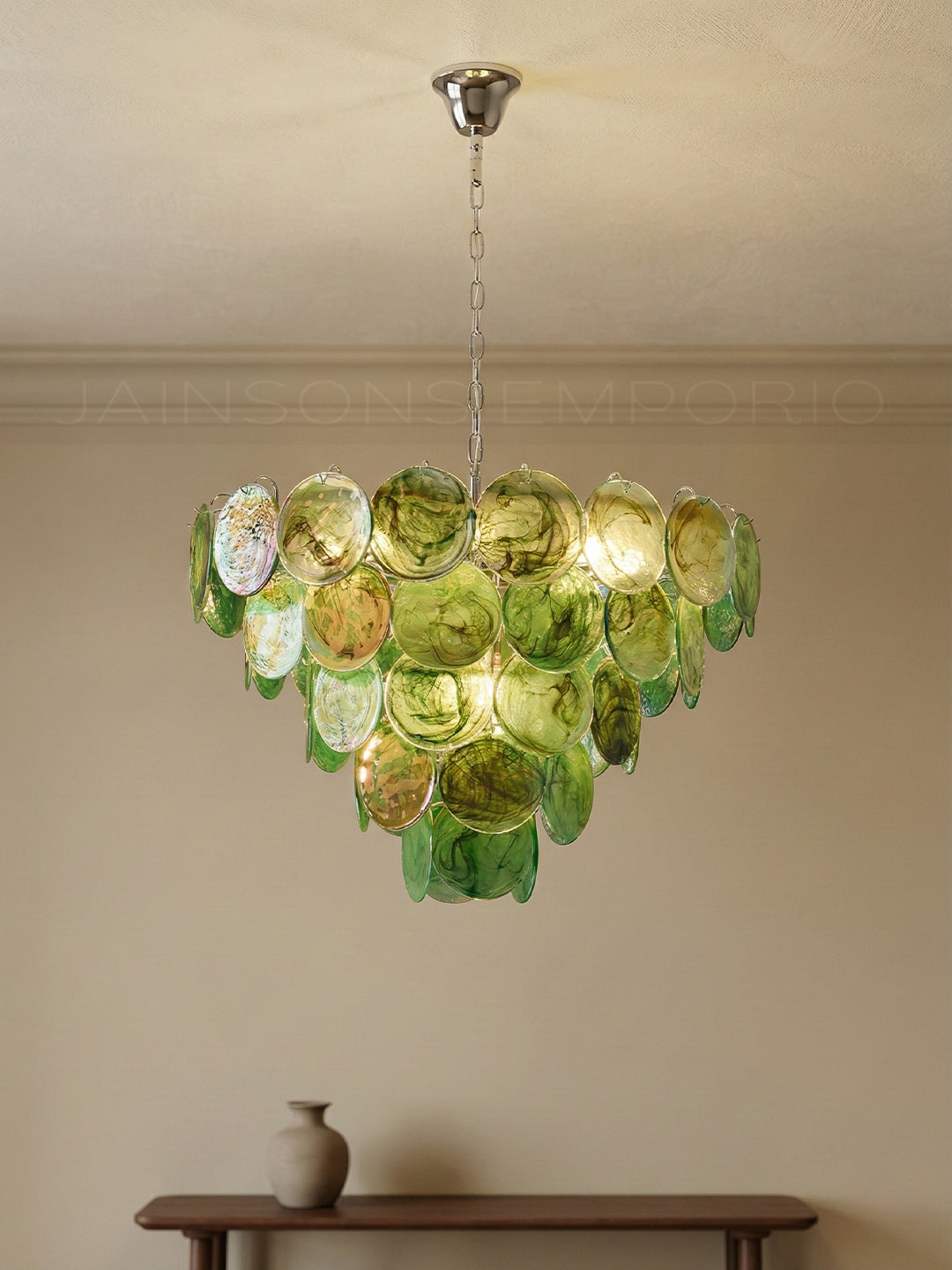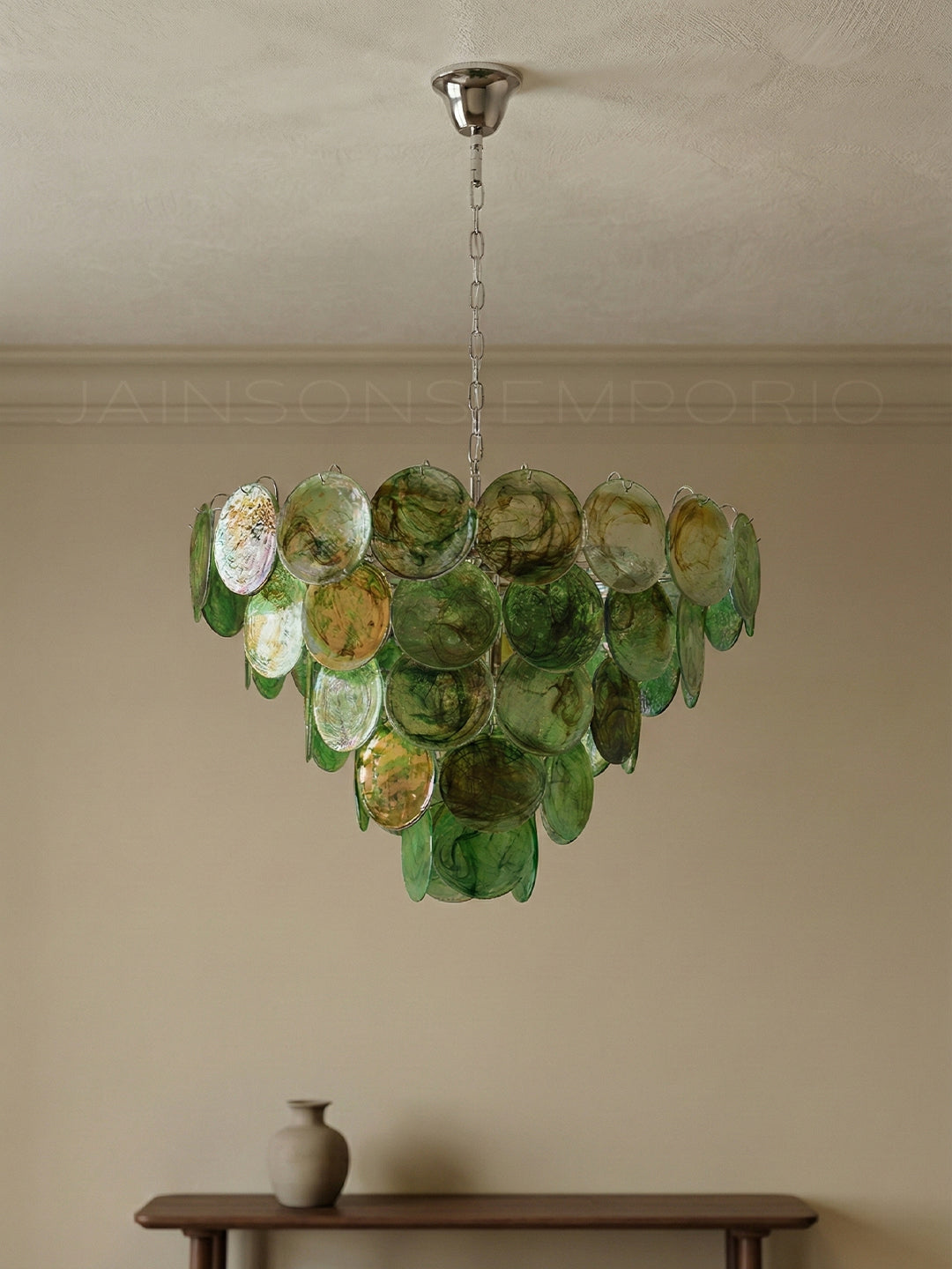 Invite the tranquility of a secret garden into your home with The Lily Pad Cascade. This stunning fixture features a tiered arrangement of translucent, moss-green glass discs that mimic the organic beauty of floating lily pads.