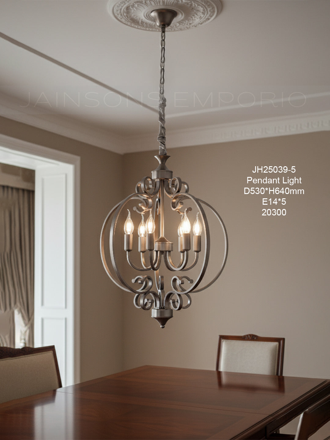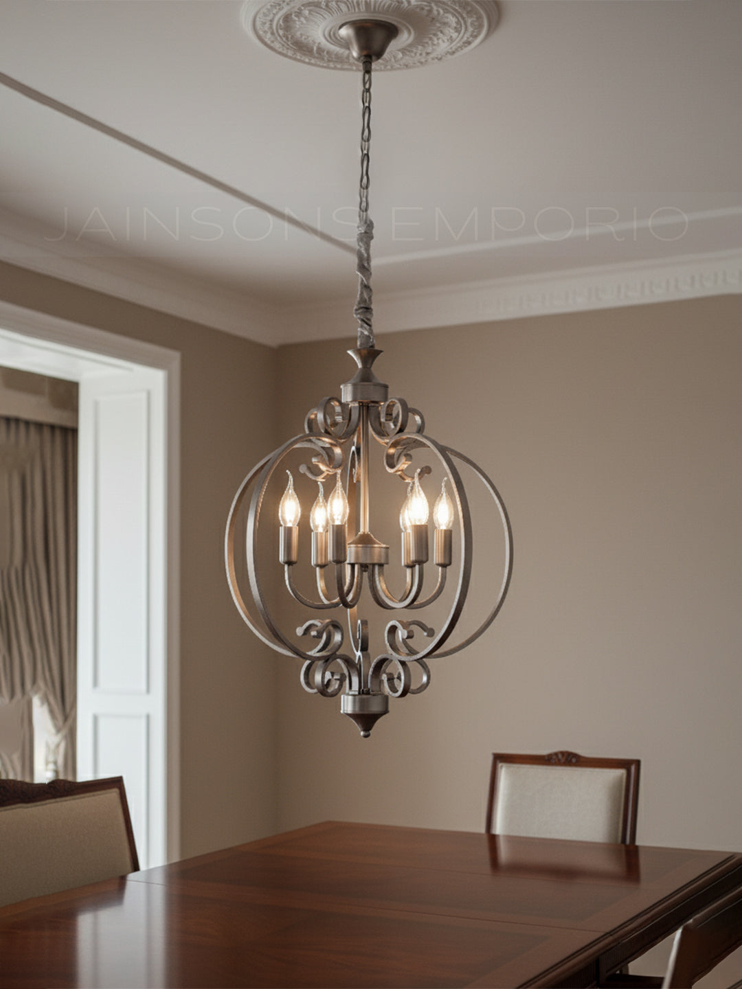 Graceful scrollwork and sweeping metal arches define this timeless fixture, bringing a touch of Old World charm to your home. The open-globe silhouette houses a central candelabra cluster, offering unobstructed, warm illumination that is perfect for welcoming guests in an entryway or foyer.
