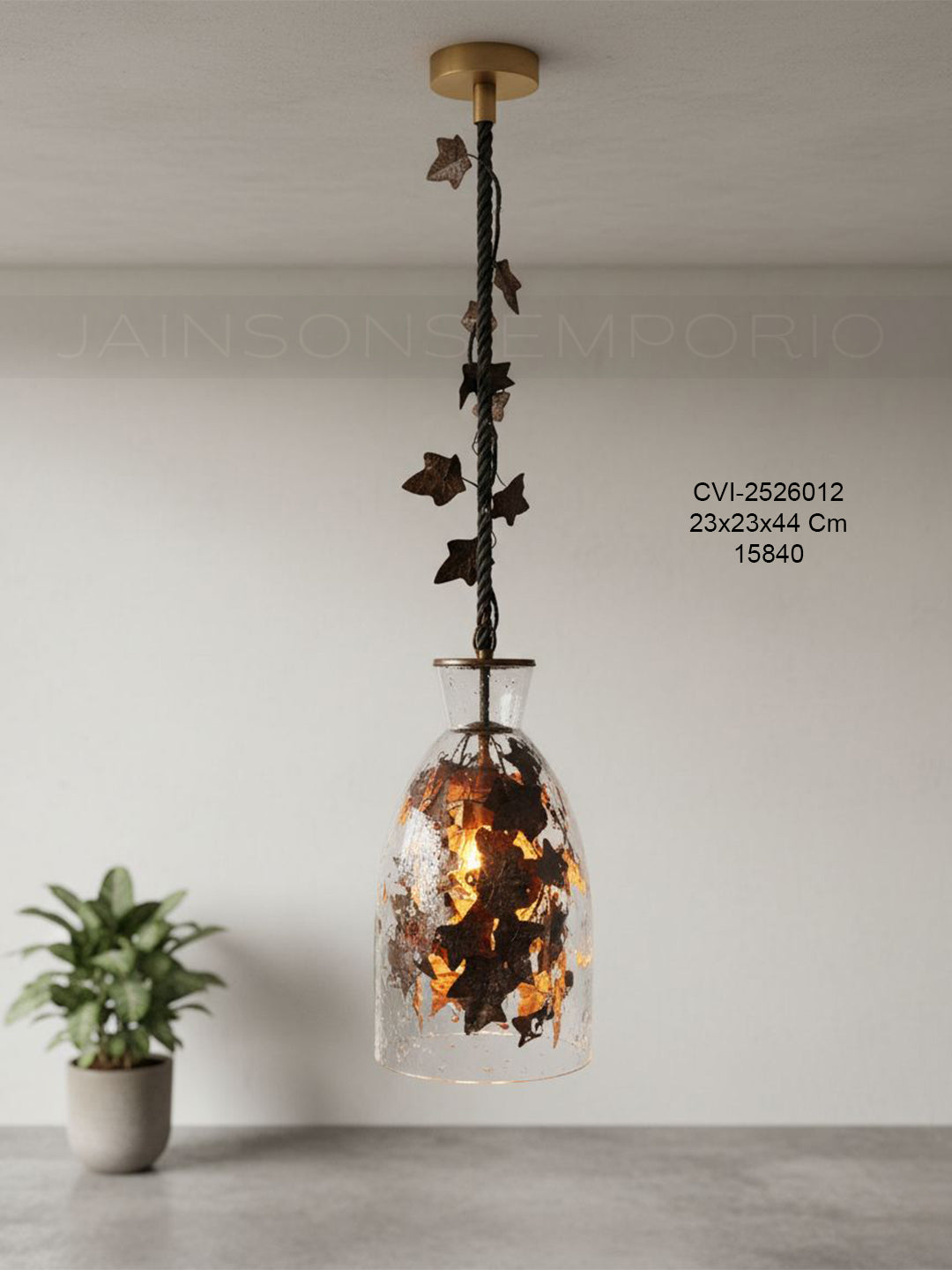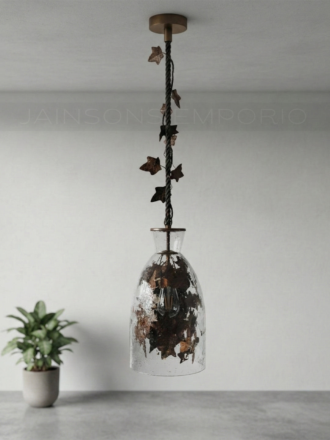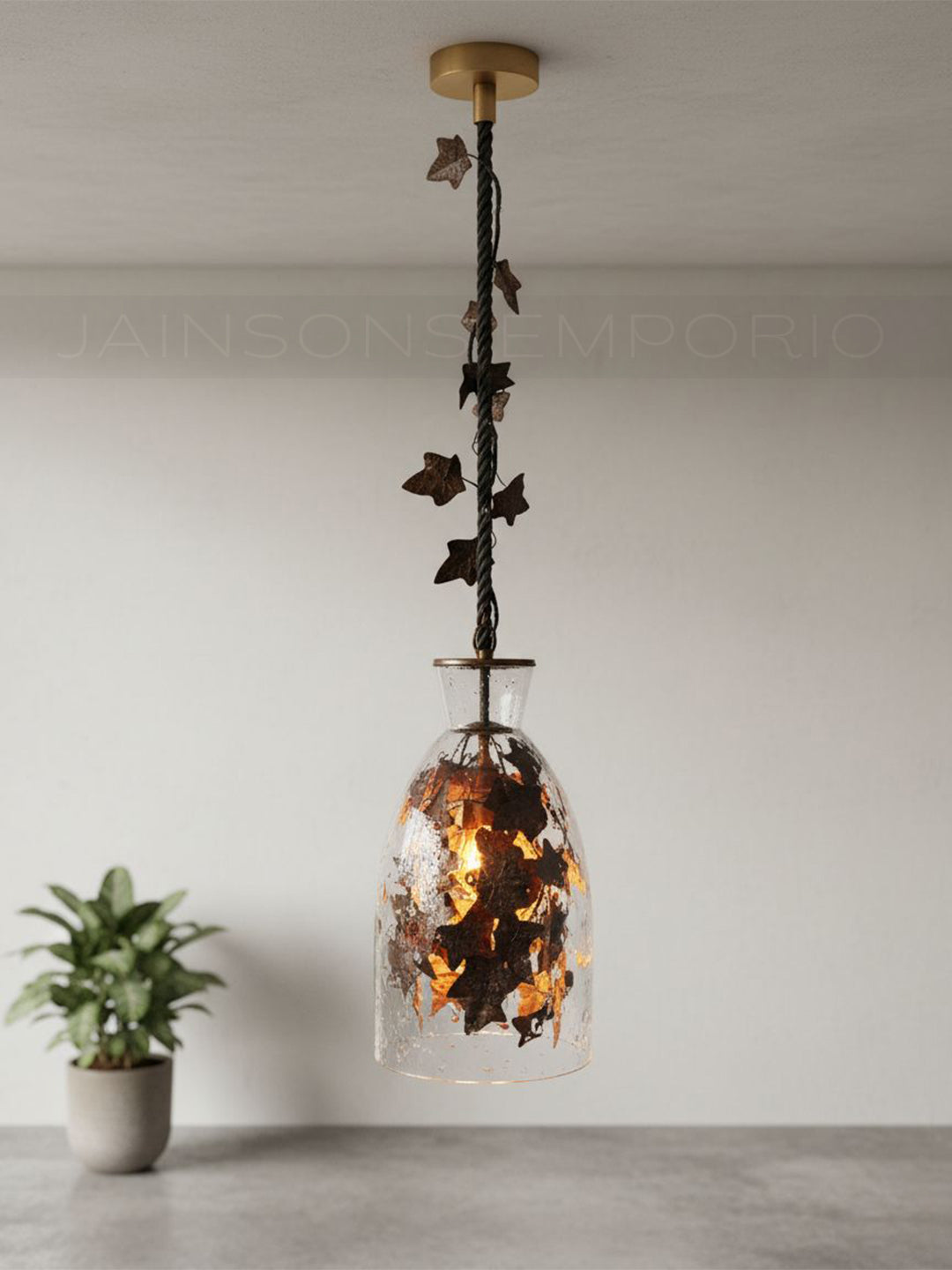 Evoking the magic of a forest floor, this pendant features a rustic rope suspension entwined with dark metal ivy that cascades into a clear glass shade. The internal foliage captures the warm light, turning the fixture into a glowing terrarium that casts captivating, organic shadows within your space.