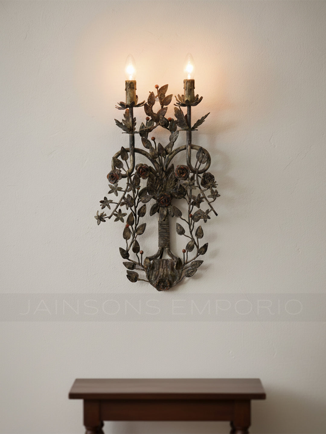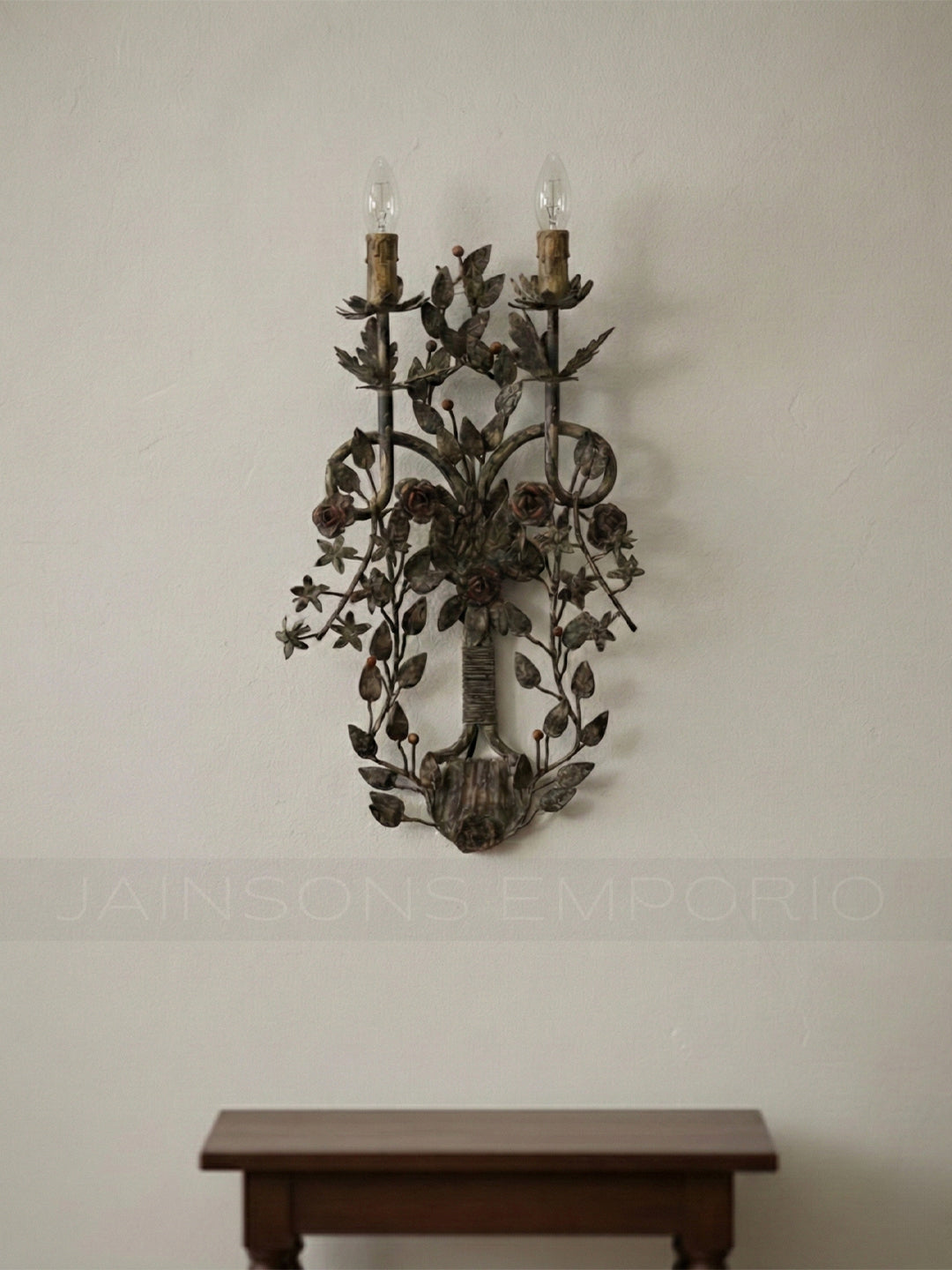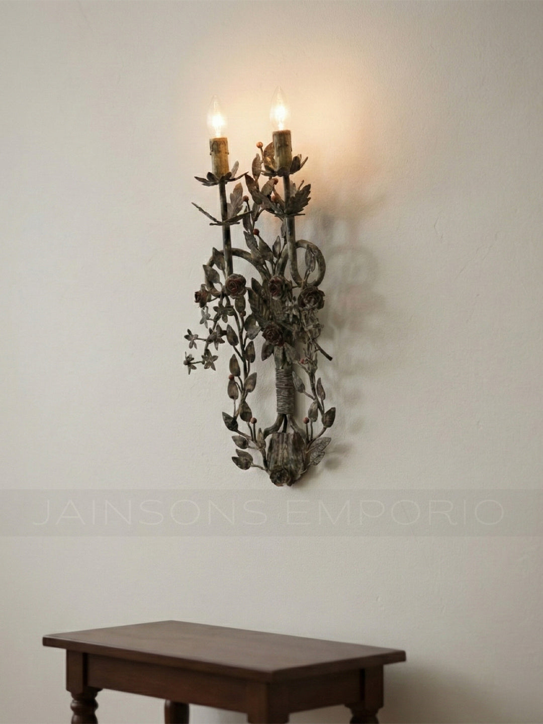 Reminiscent of a gathered wildflower bouquet, this exquisite two-light sconce features complex metalwork depicting blooming roses, starflowers, and trailing vines. The dark, weathered bronze finish is accented by subtle copper tones on the petals, creating a dramatic yet romantic focal point that brings the charm of an English garden indoors.