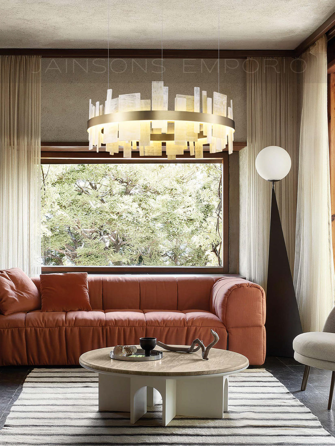 Inspired by the soft colors of dusk, this chandelier casts a warm and inviting glow, ideal for sophisticated interiors.