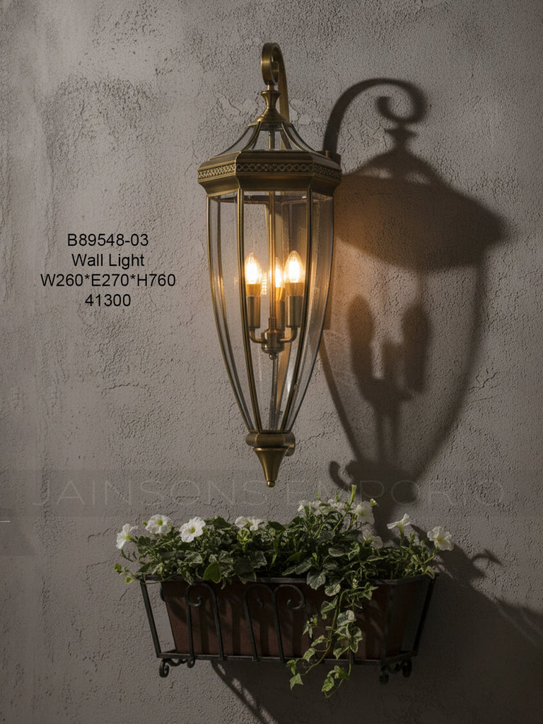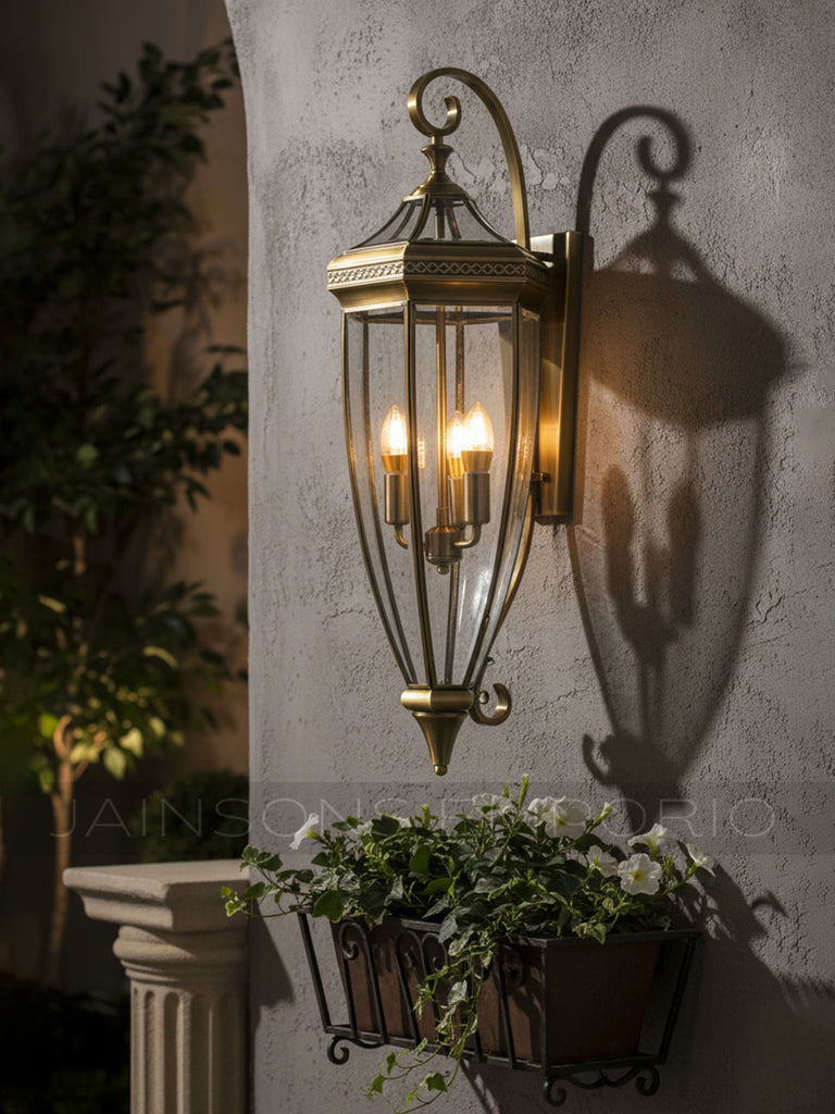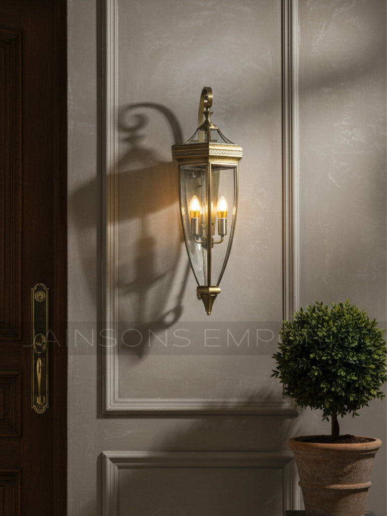 Make a grand statement with this exquisite wall lantern. A gracefully curved arm supports a stately frame with a rich, antique finish. Its clear glass panels beautifully display a classic three-light candelabra, casting a warm and elegant welcome.