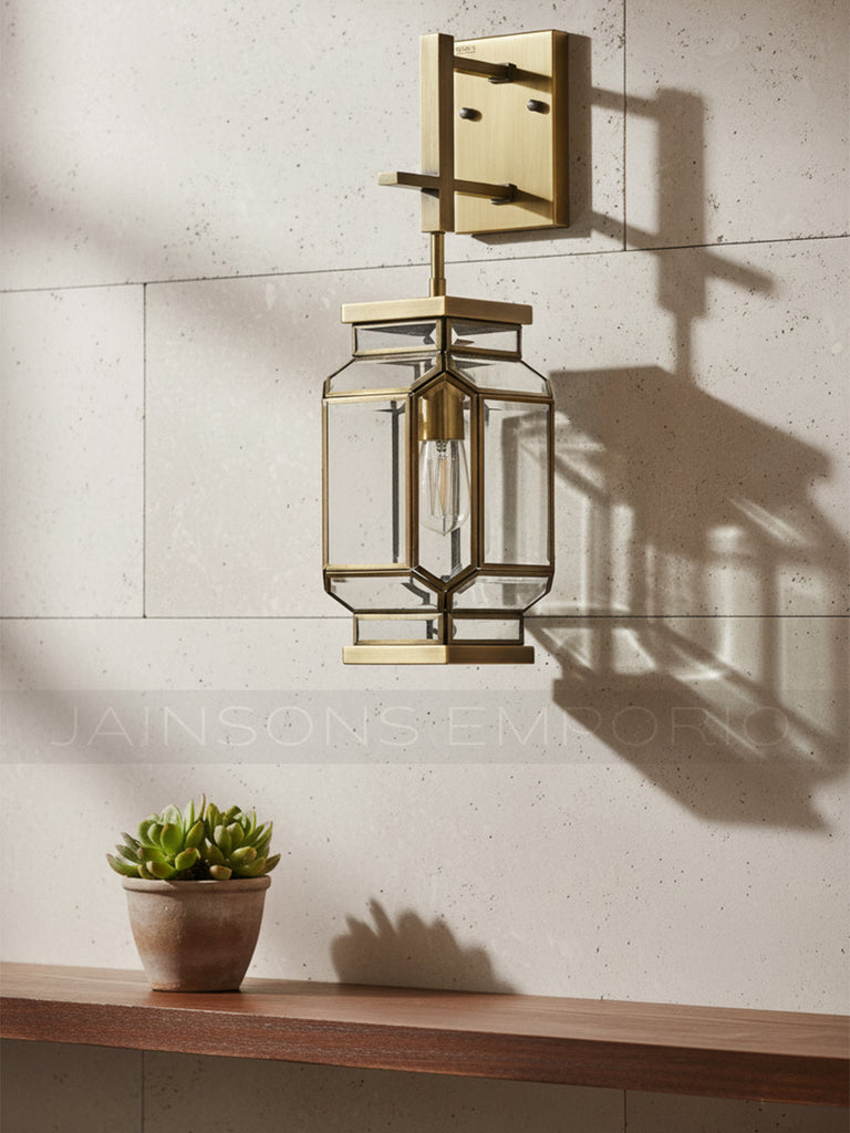 Elevate your space with the Octavia Lantern, a beautifully crafted fixture featuring faceted clear glass panels set within a warm brass frame. Its geometric silhouette allows for a brilliant display of light, creating a sophisticated ambiance. This versatile piece seamlessly blends classic charm with modern aesthetics.