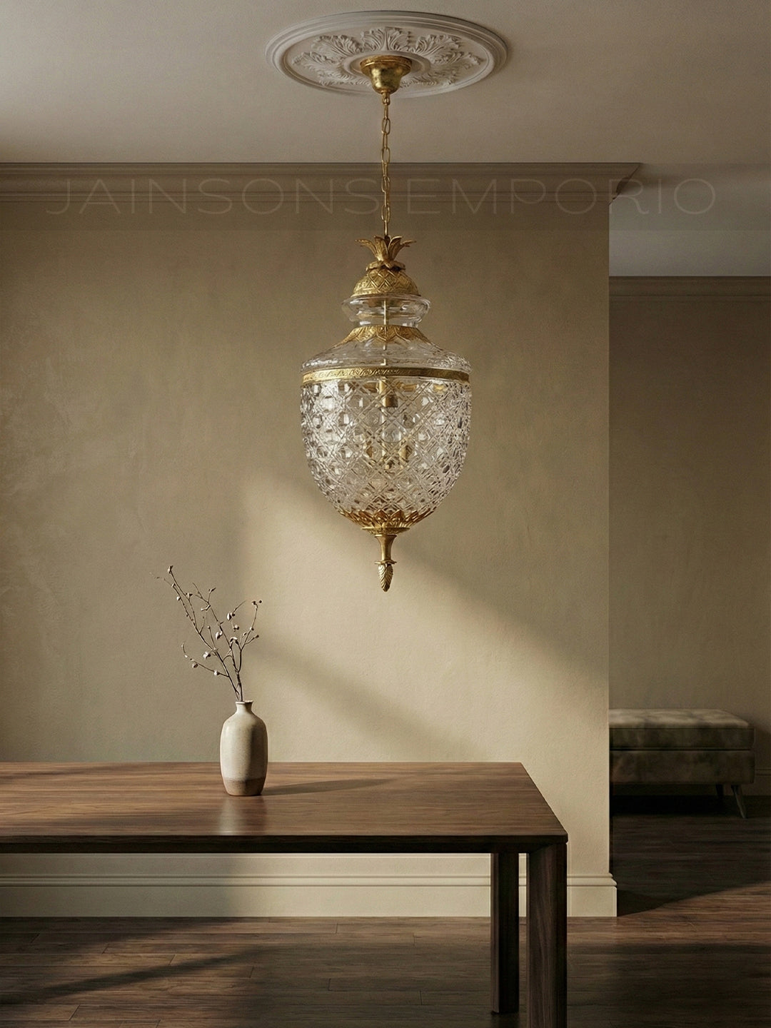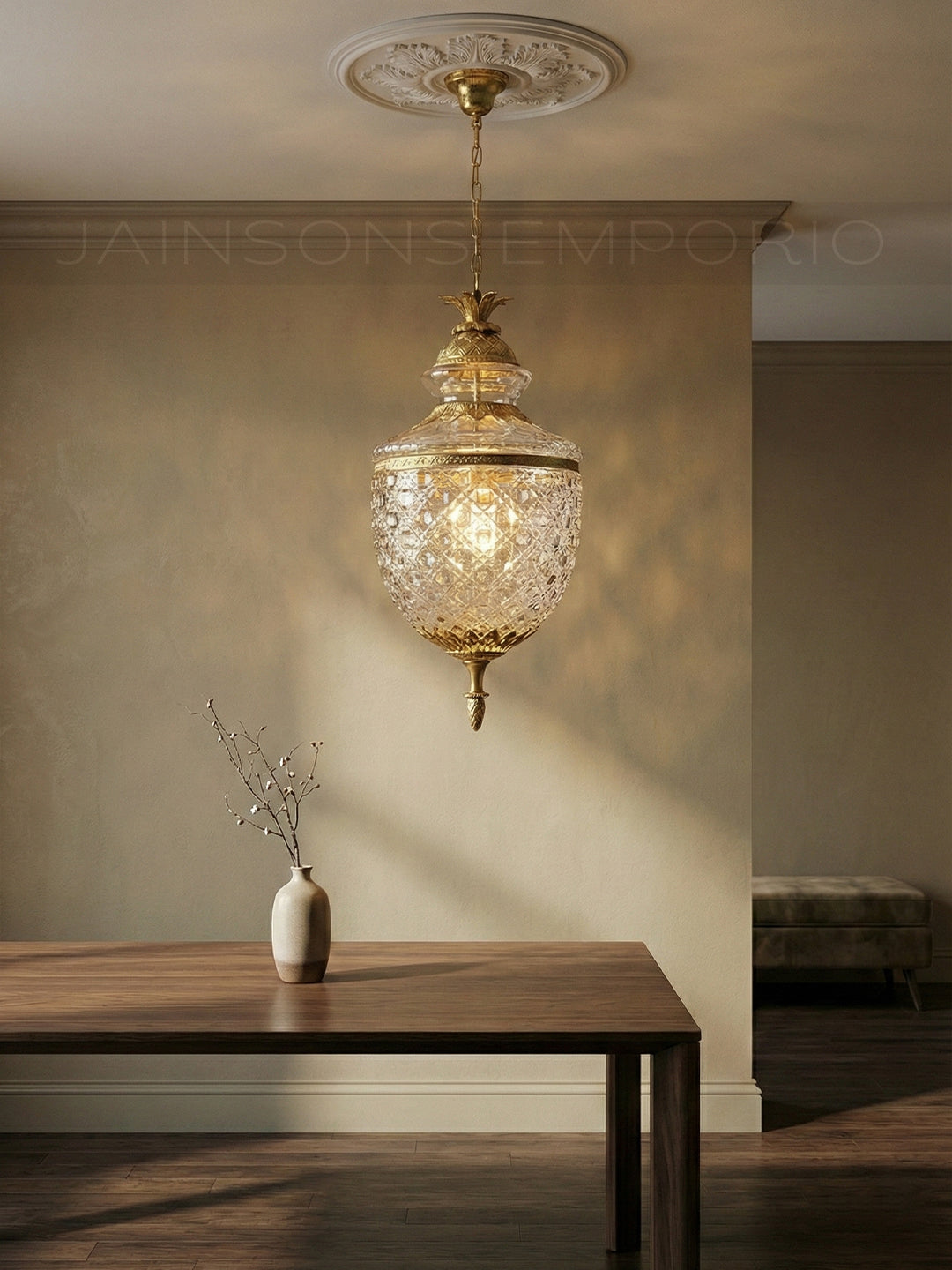 Exuding timeless elegance, this pendant features a diamond-cut crystal body crowned with antique gold metalwork, casting a warm, prismatic glow that adds a touch of regal sophistication to any space.